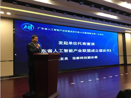 艾弗森ballbet科技副总裁顾友良作为发起单位代表宣读《广东省人工智能产业联盟成立倡仪书》